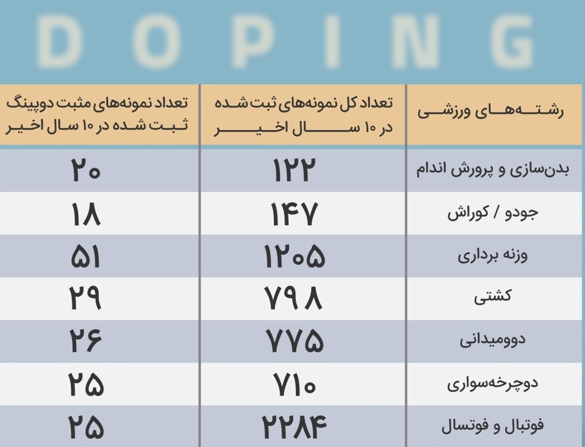 به گزارش تجربه ورزشی، جدولی با توجه به نمونه های اخذ شده از ورزشکاران در یک دهه اخیر منتشر شده که نشان می دهد بدنسازی و پرورش اندام دارای بالاترین نرخ دوپینگ مثبت در میان تمامی رشته های ورزشی است. با اینکه تعداد نمونه های اخذ شده از این رشته چندان بالا نبوده، اما تقریبا یک ششم نمونه هایی که گرفته شده، مثبت درآمده و این یک آمار ناامید کننده برای این رشته به حساب می آید.