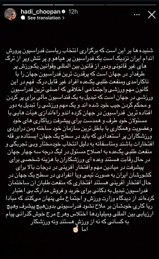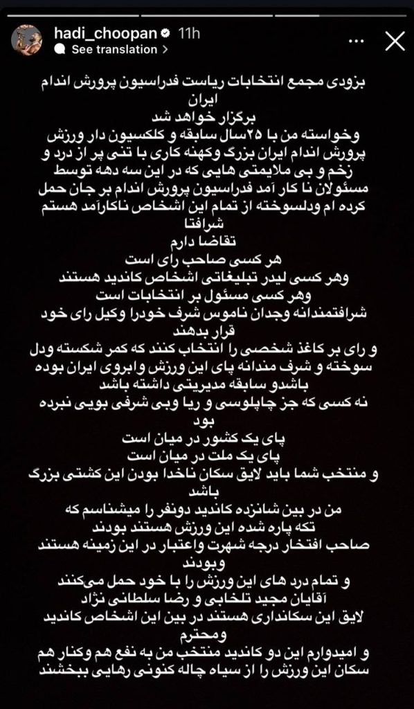 به گزارش تجربه ورزشی، در حالی که تنور انتخابات فدراسیون بدنسازی و پرورش اندام حسابی داغ شده، هادی چوپان هم در صفحه اینستاگرام خود به این موضوع ورود کرده است. تنها قهرمان ایرانی تاریخ مسترالمپیا با انتقاد از وضعیت موجود فدراسیون در دو استوری، نظر خودش را در خصوص انتخابات فدراسیون پرورش اندام و کاندیداهایی که در حال رقابت هستند، بیان کرده است.